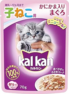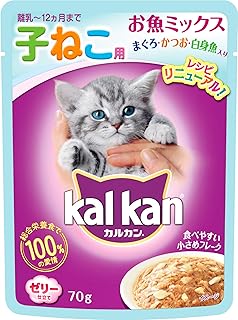 【Amazon.co.jp限定】カルカン パウチ 12ヵ月までの子ねこ用 お魚ミックス まぐろ・かつお・たい入り 70g×36袋(まとめ買い) キャットフードがペット用品ストアでいつでもお買い得。当日お急ぎ便対象商品は、当日お届け可能です。アマゾン配送商品は、通常配送無料(一部除く)。 12ヶ月までの幼猫. 特長. 厳選されたまぐろ・かつお・白身魚をカルカン特製だしで煮込み、ジューシーなゼリー仕立てにしました。. 成長期にある子ねこに必要な栄養素がバランスよく含まれた総合栄養食です。. 食べやすい小さめフレーク。. 内容量. 70g×16