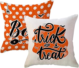 ULOVE LOVE YOURSELF オレンジハロウィン クッションカバー トリックオアトリート/ブー ハッピーハロウィン 装飾枕カバー 18×18インチ ブラックスパイダー/コウモリ ファームハウス ホリデーデコレーション 2個セット ソファ/カウチ用