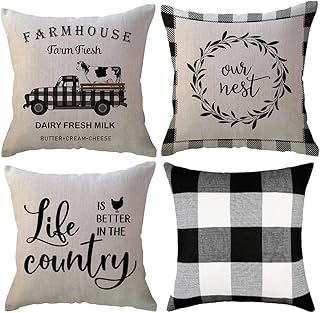 ULOVE LOVE YOURSELF ファームハウス 装飾枕カバー 農場 新鮮 ヴィンテージ 牛 トラック チキン/ブラックチェッカー 格子縞 クッションカバー 農場 素朴 装飾枕カバー 18 x 18インチ
